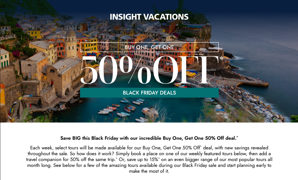 Black Friday has officially arrived at Insight Vacations, and this year’s savings are huge! For a limited time, you can Buy One, Get One 50% Off on select weekly featured tours.