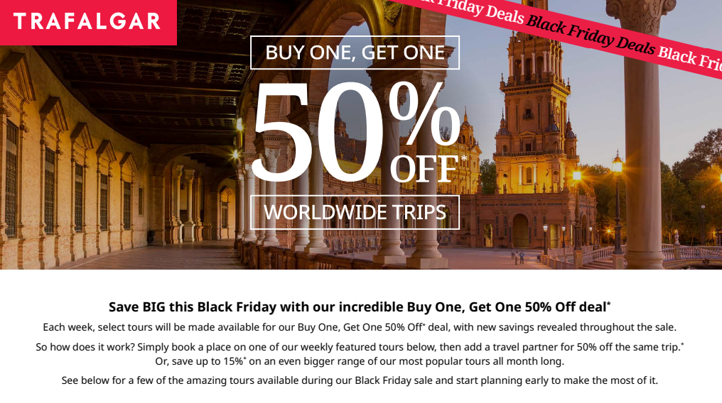 Black Friday has arrived at Trafalgar, bringing some of the most exciting savings of the season. This year’s highlight is a limited-time Buy One, Get One 50% Off offer on select weekly featured tours, with new itineraries revealed throughout the sale.