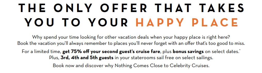 Your Happy Place Awaits with Celebrity Cruises! Why search for another deal when the perfect one is right here? For a limited time, get 75% off your second guest’s cruise fare, plus, bonus savings on select dates.