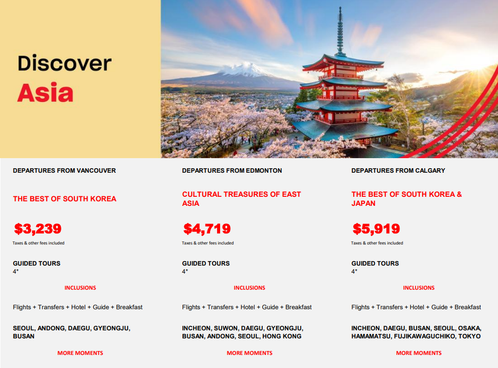 With Air Canada Vacations, you can explore destinations like South Korea, Japan, and Hong Kong on guided tours that take care of the logistics—so you can focus on the experience.