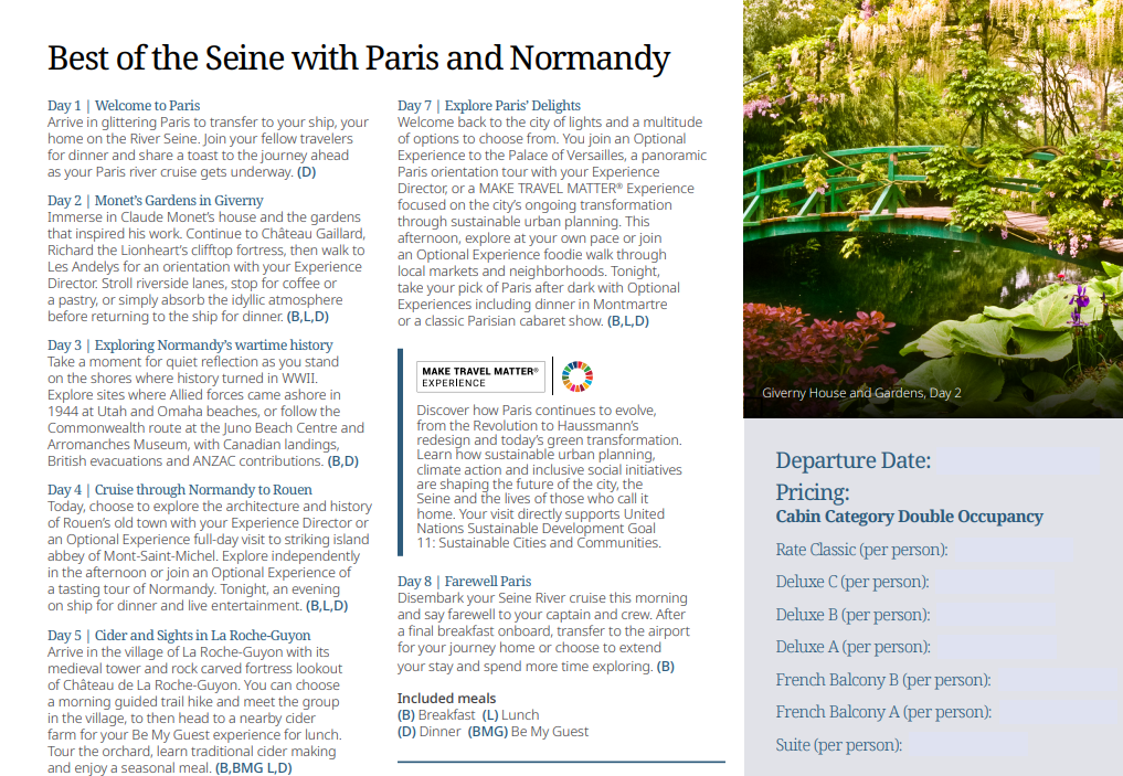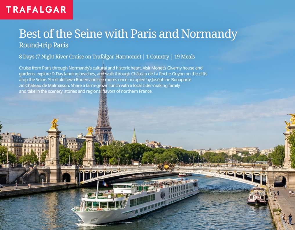 Set sail on the Best of the Seine journey with a 7-night river cruise aboard Trafalgar Harmonie, starting and ending in Paris. From iconic sites like Cologne Cathedral and the “Council of Europe” areas to immersive local experiences, this thoughtfully led itinerary balances must-see moments with relaxed exploration.