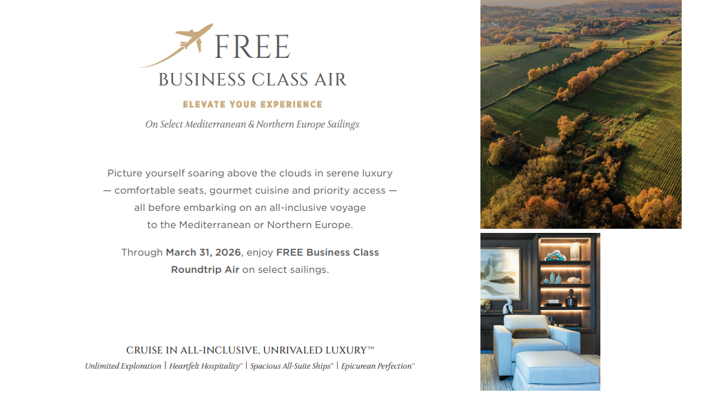 For a limited time, enjoy FREE Business Class Roundtrip Air on select Regent sailings when you book by March 31, 2026. From sun-drenched Mediterranean shores to the storybook cities of Northern Europe, your journey begins the moment you leave home.
