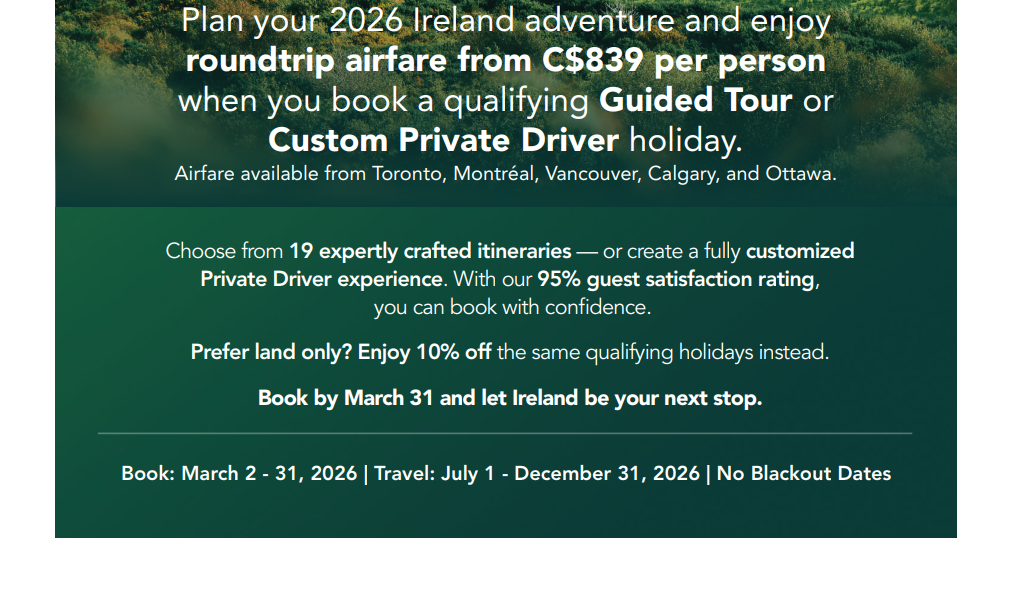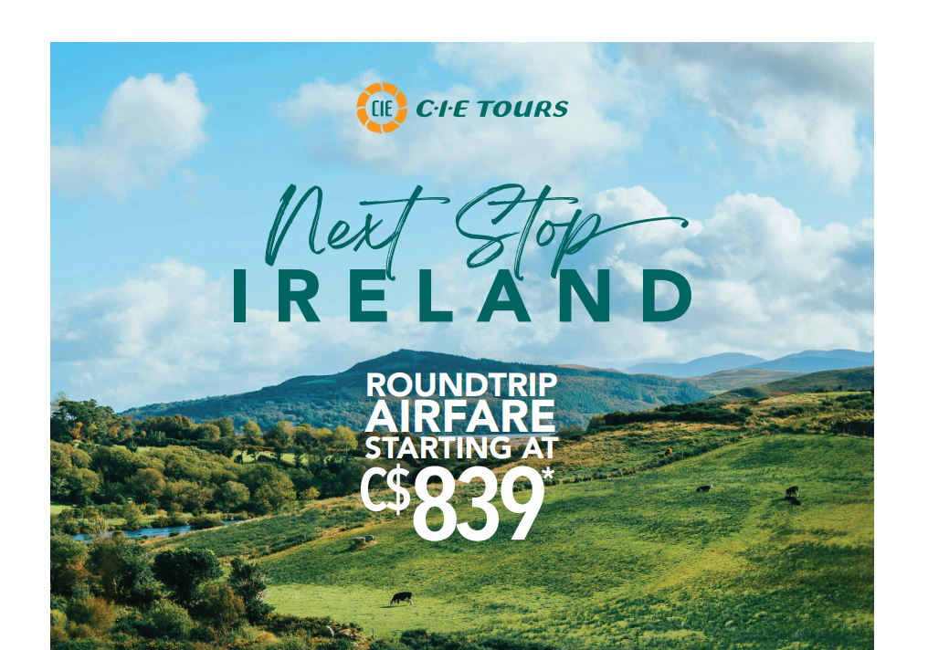 Plan your dream Ireland adventure with CIE Tours and enjoy round-trip airfare from C$839 per person when you book a qualifying Guided Tour or Custom Private Driver holiday. Departures available from Toronto, Montréal, Vancouver, Calgary, and Ottawa.