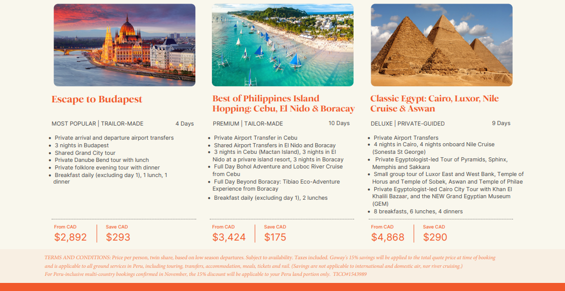 This month only, enjoy incredible savings on unforgettable adventures worldwide! Explore the ancient wonders of Peru, unwind in tropical paradises like Tahiti and Bora Bora, discover cozy mountain escapes in Switzerland and more.