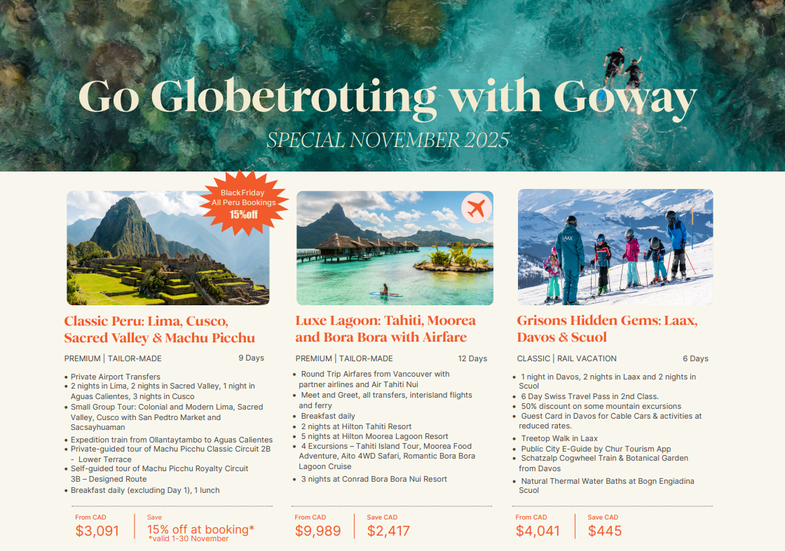 This month only, enjoy incredible savings on unforgettable adventures worldwide! Explore the ancient wonders of Peru, unwind in tropical paradises like Tahiti and Bora Bora, discover cozy mountain escapes in Switzerland and more.