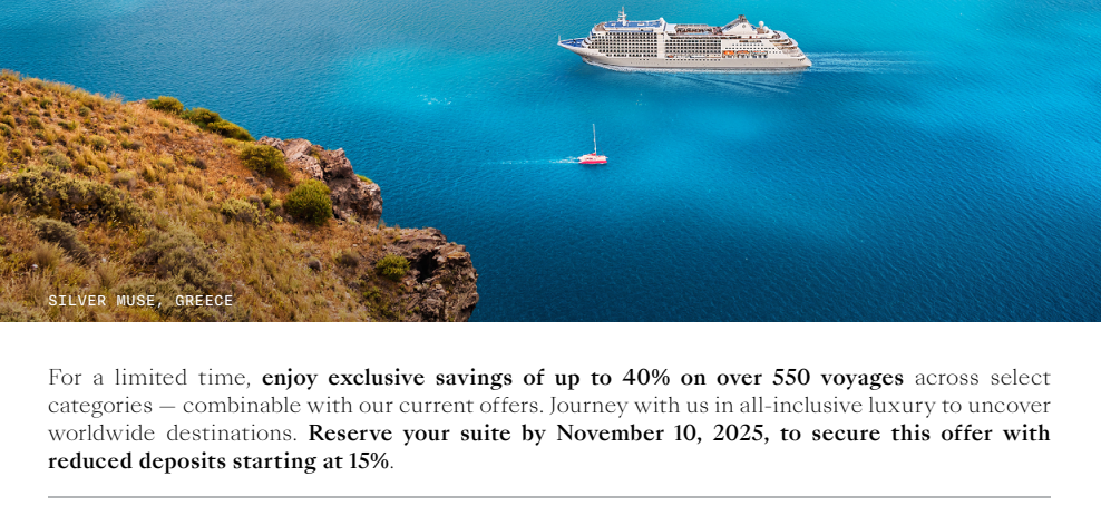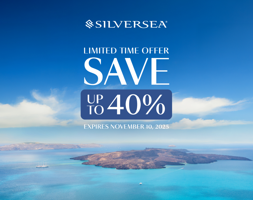 For a limited time, enjoy up to 40% savings on over 550 voyages, from the Mediterranean to the ends of the earth, all in all-inclusive Silversea style.
