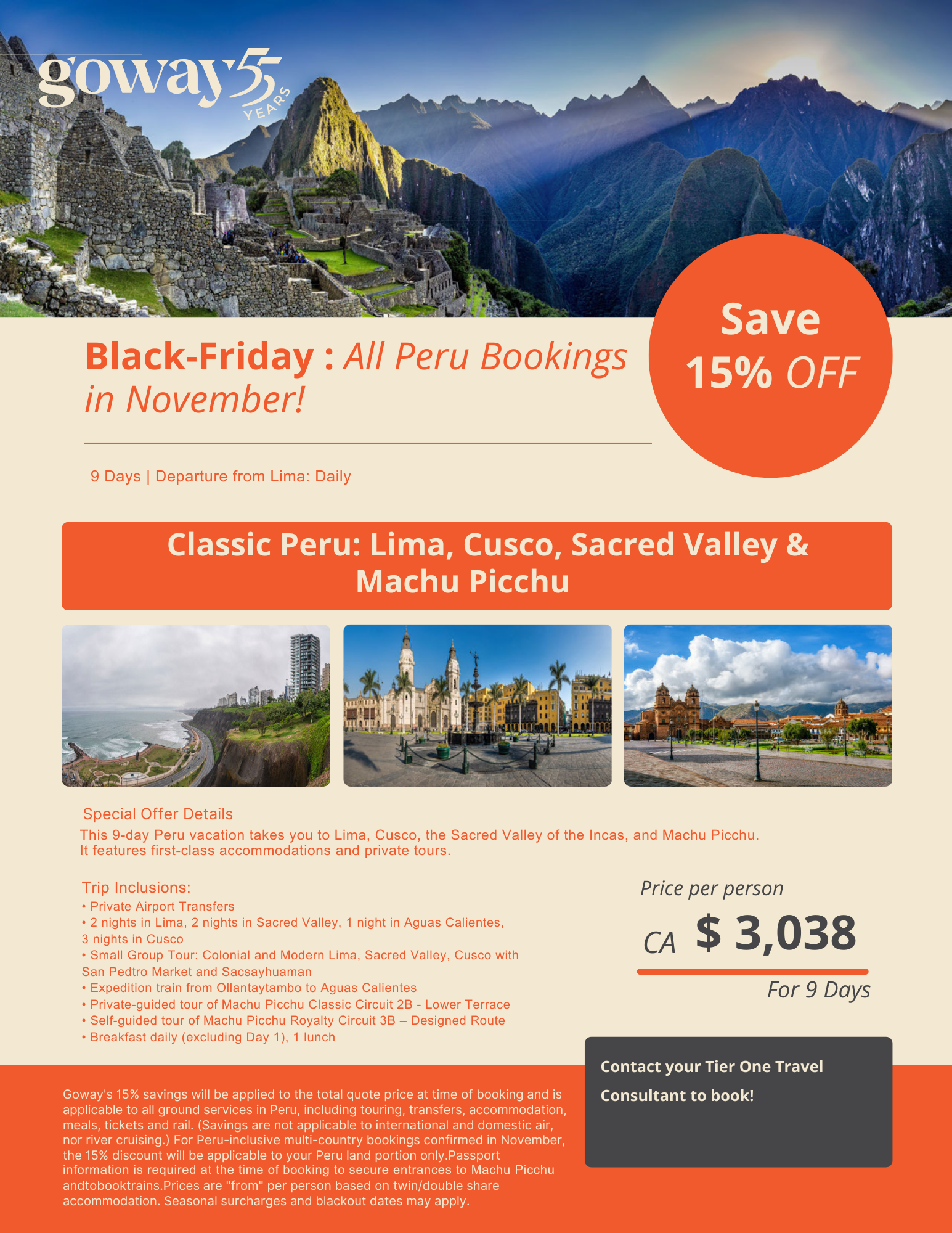 This month only, enjoy incredible savings on unforgettable adventures worldwide! Explore the ancient wonders of Peru, unwind in tropical paradises like Tahiti and Bora Bora, discover cozy mountain escapes in Switzerland and more.