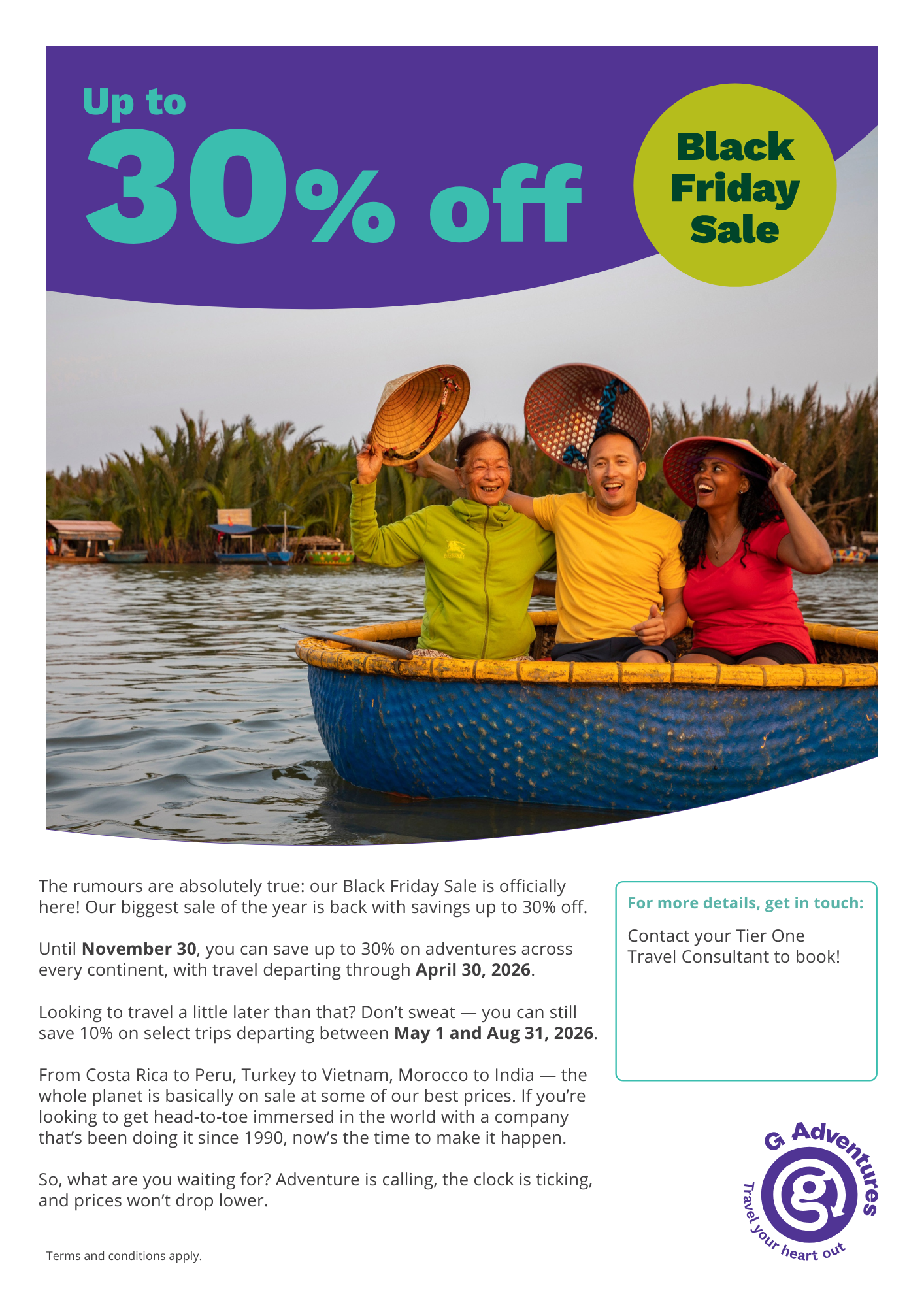 Small group travel. Supersized savings. Save up to 30% on 600+ trips across the world during G Adventures’ biggest sale of the year! Get head-to-toe immersed in iconic destinations with a company that’s been doing it since 1990.